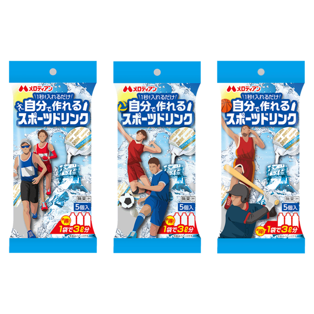 昨年より好評販売中の「自分で作れるスポーツドリンク」から、スポーツデザインを、2024年5月より数量限定で発売いたします。スポーツが特に盛り上がる春から夏にかけて、スポーツシーンを応援したい、運動する方にもっと使っていただきたいという思いを込め、マラソン・サッカー・バレーボール・バスケットボール・野球をするシーンのイラストを入れた躍動感のあるデザインです。