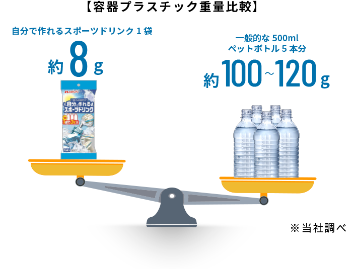 また、ペットボトルタイプのスポーツドリンクと容器プラスチック重量を比較すると、一般的な500mlペットボトル6本分に対して、自分で作れるスポーツドリンク1袋(5個入り)は容器プラスチック重量を約94%削減することができ、環境にもやさしい商品です。