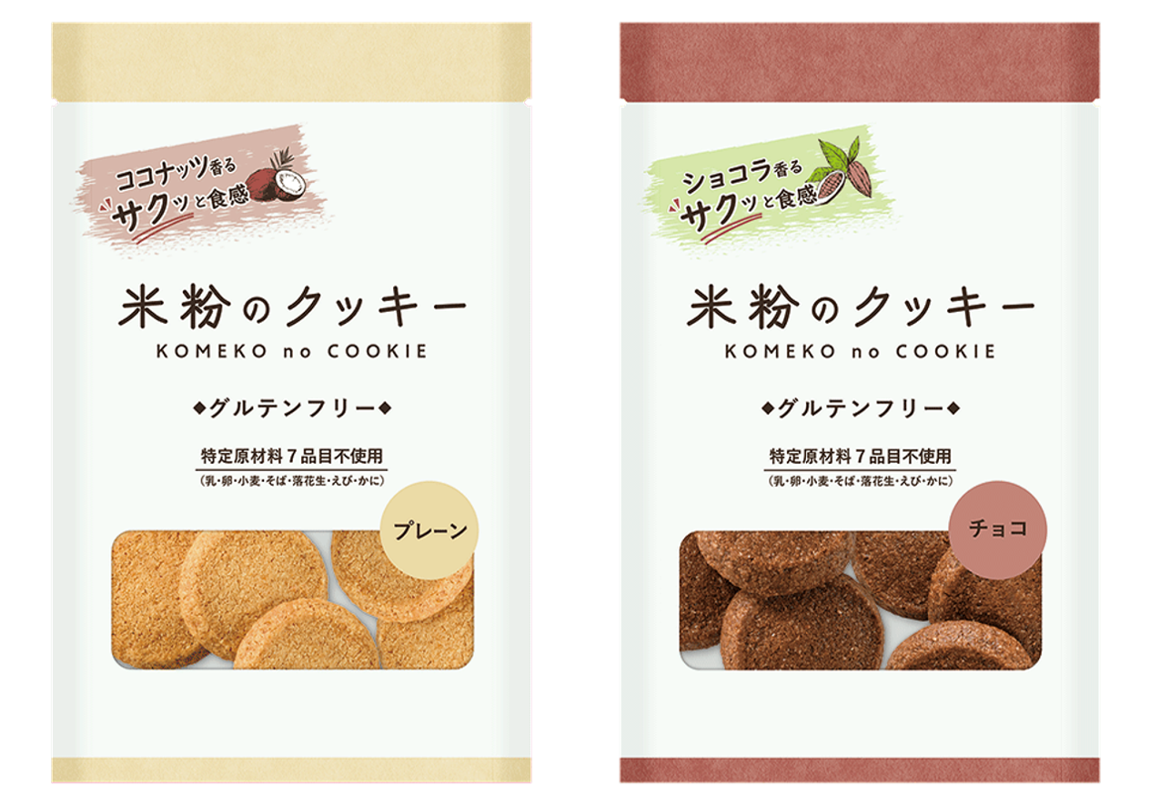 シリーズ商品として「米粉のクッキー(プレーン・チョコ)」も発売中。おからのクッキー同様、特定原材料7品目不使用でからだにやさしいクッキーです。