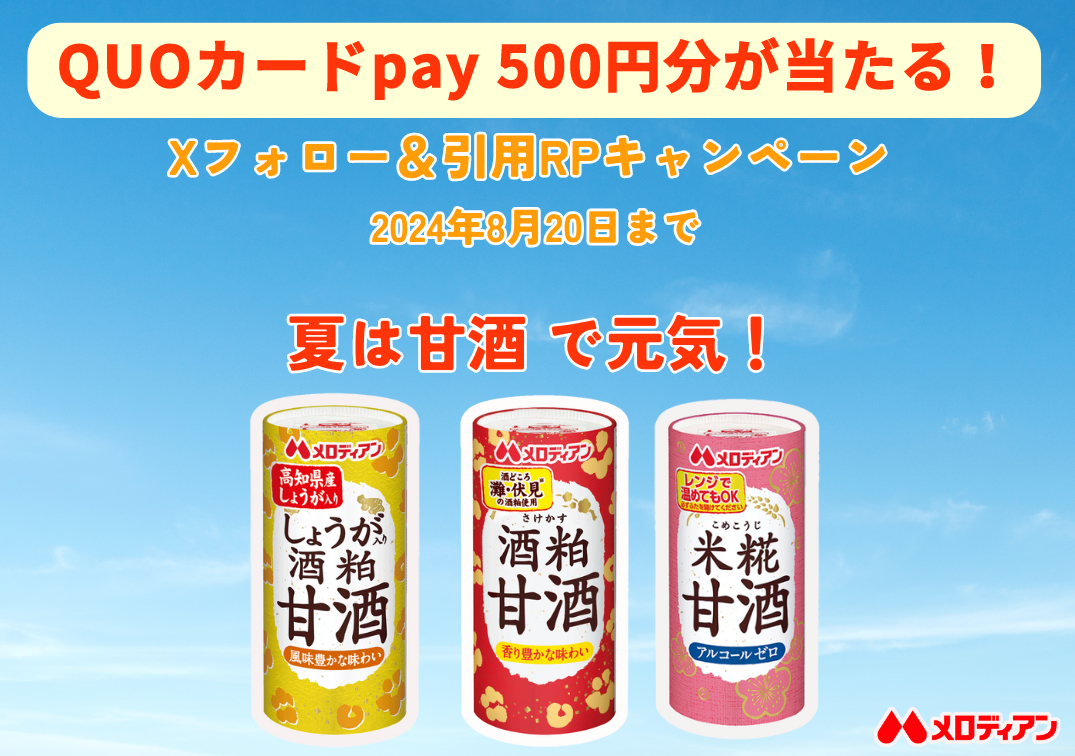 メロディアン公式X(旧Twitter)において、QUOカードPay500円分が当たる 甘酒キャンペーンを実施します。