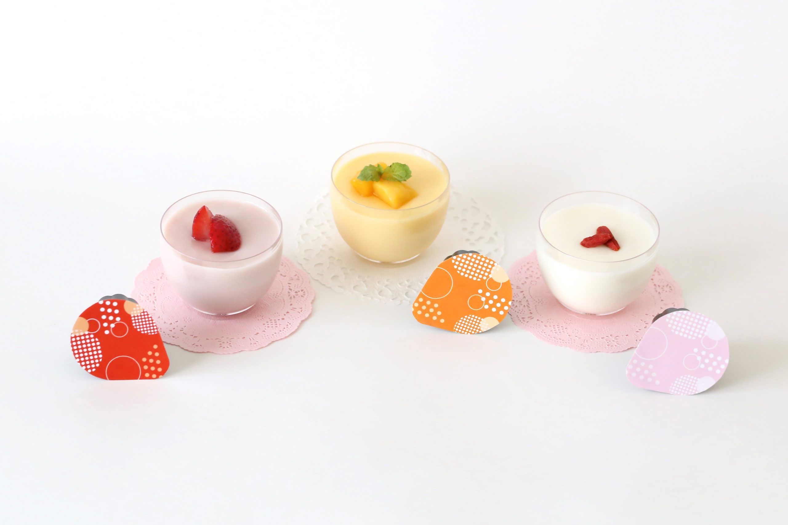 牛乳と混ぜるだけで、ぷるぷる食感のプチデザートが簡単に作れます。ポーション容器に入った個包装で、好きな時に食べたい分だけできるのがポイントです。いちご・マンゴー・杏仁の3種類の味をご用意しました。お子さまから大人まで、幅広い世代にお召し上がりいただける甘くやさしい味わいに仕上げています。