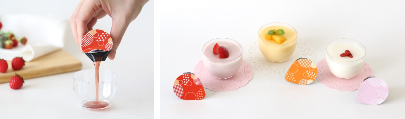 ポーション容器に入った個包装で、好きな時に食べたい分だけ作れるのがポイントです。いちご・マンゴー・杏仁の3種類の味をご用意しました。お子さまから大人まで、幅広い世代にお召し上がりいただける甘くやさしい味わい。