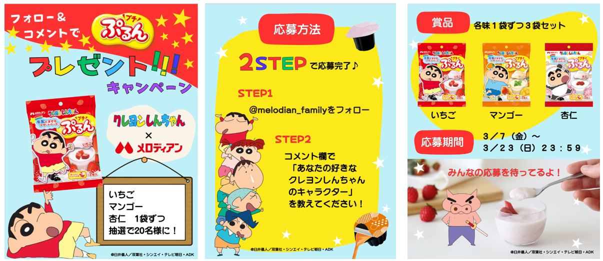 メロディアンの公式アカウント(@melodian_family)をフォローし、キャンペーン投稿に「クレヨンしんちゃんの好きなキャラクター」をコメントすると、抽選で20名様にプチぷるん各味(いちご・マンゴー・杏仁)1袋ずつ合計3袋が当たります。