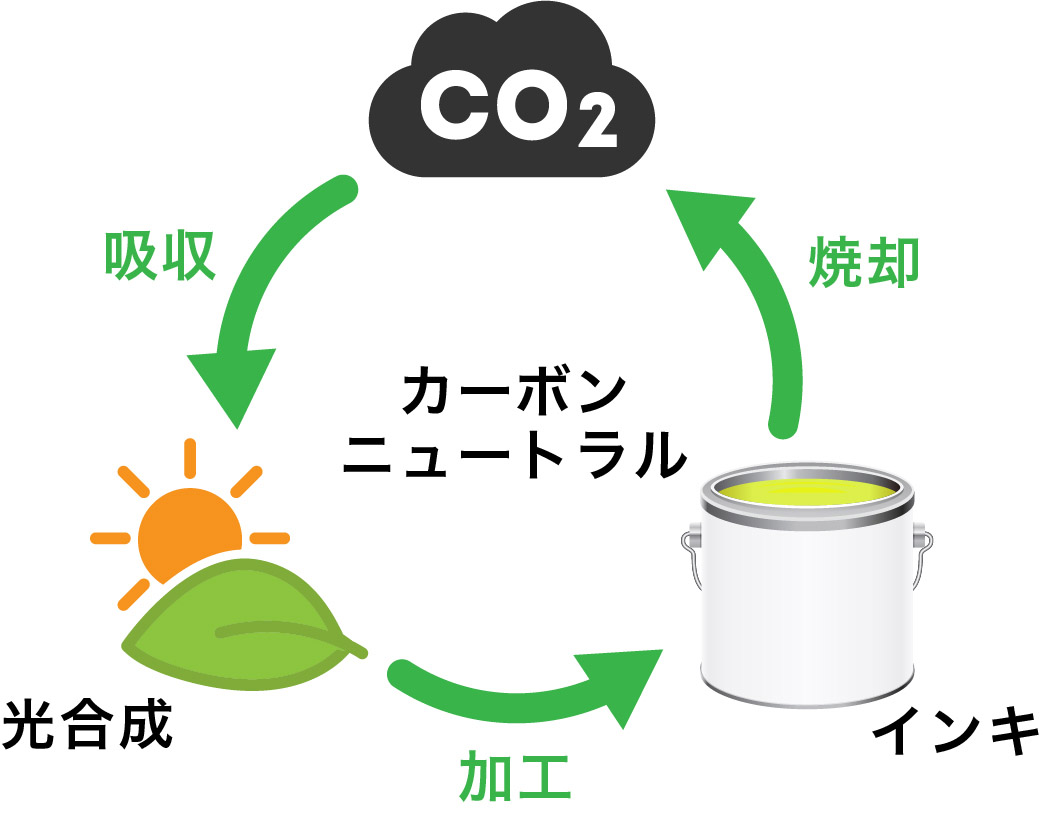 バイオマスインキは、原料の植物が成長する過程でCO₂を吸収するため、廃棄の際の燃焼時に同量のCO2を排出しますが、バイオマス原料が燃焼時に排出するCO2は、カーボンニュートラルの観点から温室効果ガスではないとみなされます。