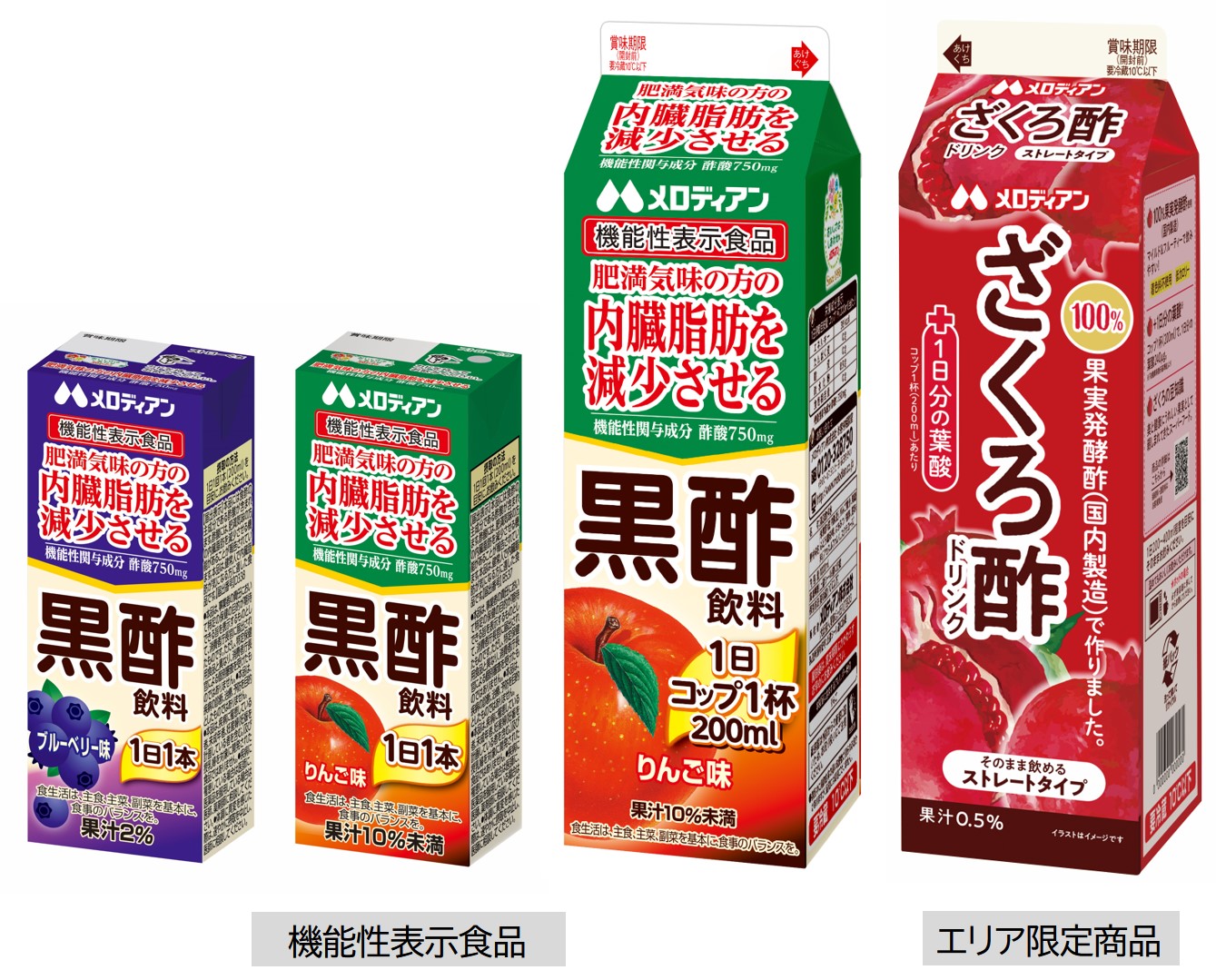 肥満気味の方の内臓脂肪を減少させる機能がある酢酸を配合した『黒酢飲料』りんご味・ブルーベリー味や、果実発酵酢(国内製造)で作った『ざくろ酢』も製造販売しています。